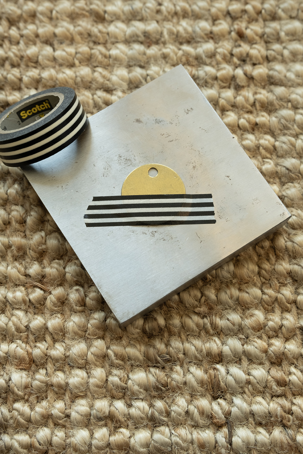 Then I tape the tag into place on my steel bench block. If you don’t have a bench block, you could also use a scrap piece of wood- a thicker piece, like a 2×4 would be best. I like to use washi tape to secure the tag because it is easy to move around without leaving a residue. The tape keeps the tag in place, and also acts as a guide to keep the letters lined up straight. If I’m doing multiple rows, I readjust the tape with each row of letters.