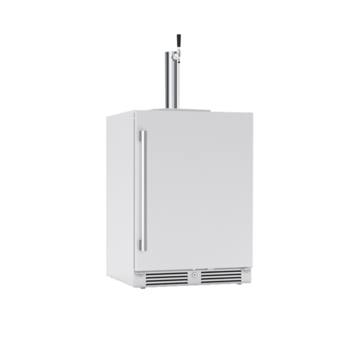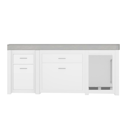 We renovated this space on a budget, tiling over the concrete, and installing semi-custom outdoor cabinets, refrigeration, a beverage tap, and a grilling station. We host outdoors on our patio often, so we wanted to maximize the functionality and visual appeal of this space.