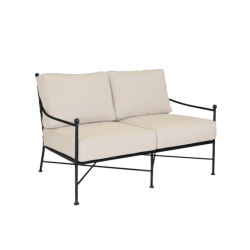 The bedroom balcony was a blank slate that really just required paint for an upgraded look. Not only did I paint the floor, but I also painted the brick and columns for a brighter aesthetic. I added a bistro table, two chairs, a loveseat, and an ottoman for an inviting & functional seating arrangement. I also installed outdoor drapery for added privacy, and new exterior light fixtures.